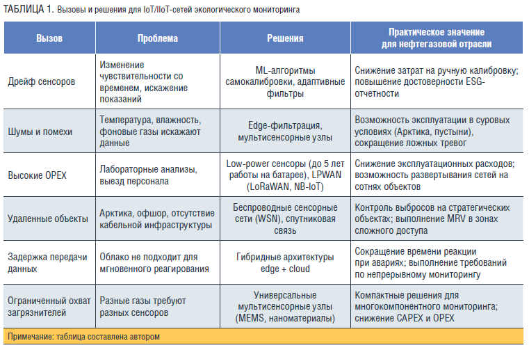 Таким образом, в таблице 1 обобщенно представлены ключевые вызовы, с которыми сталкиваются IoT/IIoT-сети экологического мониторинга, а также научные и инженерные решения для их преодоления. Показано, что каждое технологическое ограничение (от дрейфа сенсоров до проблем связи и энергопотребления) имеет конкретные пути решения, что делает такие системы все более надежными и применимыми в условиях нефтегазовой отрасли.