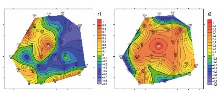 - Влияние ГРП на ближайшие скважины. Большинство традиционных моделей гидроразрыва пласта моделируют распространение лишь простых трещин, что иногда не соответствует действительности. В ходе анализа результатов проведения ГРП на скважине 221 Шершневского нефтяного месторождения выяснилось, что после гидроразрыва увеличился дебит не только данной скважины, но и шести ближайших добывающих скважин (скважины 64, 214, 215, 222, 228, 229) [24]. Был проведен корреляционный анализ взаимного влияния дебитов этих скважин до и после ГРП. Оказалось, что до гидроразрыва ощутимая положительная корреляция дебитов была лишь у двух пар скважин: 221–214 и 215–222, причем между самими парами существовала значительная отрицательная корреляция, что может говорить о некотором перераспределении объемов дренирования между ними. После ГРП произошло увеличение дебитов всех ближайших скважин, о чем свидетельствует наличие сильных корреляционных связей между ними (рисунок 4) [24].