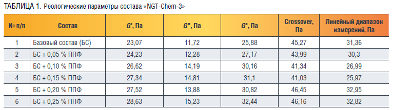 Осцилляционные исследования выполняли с разверткой по напряжению сдвига при частоте колебаний в 1 Гц. Основные измеряемые параметры: модуль упругости (G´), модуль вязкости (G´´), комплексный модуль (G*), точка кроссовера (точка пересечения G´ и G´´), соответствующая пределу текучести, а также линейный диапазон измерений. В ходе экспериментов производили несколько замеров, результаты которых затем усредняли и рассчитывали стандартное отклонение. В таблице 1 приведены реологические параметры базового и модифицированного ППФ состава «NGT-Chem-3».