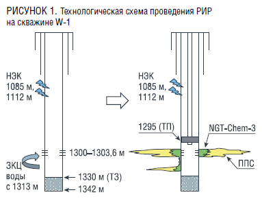 Скважина W-1 Демкинского месторождения представляет собой эксплуатационную колонну диаметром 168 мм, спущенную до глубины 1342 м. Перфорацией вскрыт бобриковский горизонт. Пласт терригенный, поровый, характеризуется следующими параметрами: Кпр – 668 мД, Кп – 21,3 %. Дата ввода скважины в эксплуатацию: 09.2003 г. (с параметрами Qж = 24,1 м3/сут, Qн = 22 т/сут, обводненность 1 %). Обводненность скважины начала быстро расти с 40 % в 2017 г. до 90 % в конце 2023 г. и на момент проведения РИР достигла 99 %. По данным промысловых геофизических исследований от 22.11.2024 г., отмечались приток воды из интервала перфорации и заколонное движение воды снизу вверх, с глубины на 10 м ниже интервала перфорации. РИР на скважине W-1 были проведены в ноябре 2024 г. Закачивание составов осуществляли через компоновку насосно-компрессорных труб с пакером. Перед проведением работ приемистость интервала обработки составила 120 м3/сут при давлении 70 атм. В обрабатываемый интервал было закачано 15 м3 ППС и 3 м3 докрепляющей композиции «NGT-Chem-3» (без наполнителей). Начальное давление закачивания составило 100 атм, конечное – поднялось до 120 атм. Технологическая схема проведения РИР на скважине W-1 приведена на рисунке 1.