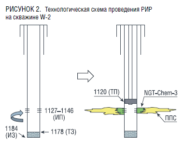 Скважина W-2 Зюзеевского месторождения представляет собой эксплуатационную колонну диаметром 168 мм, спущенную до глубины 1204 м. Перфорацией вскрыт башкирский ярус. Пласт карбонатный, трещиноватый, характеризуется следующими параметрами: Кп – 17,2; Кгл – 0,8. После ввода в эксплуатацию из бурения скважины длительное время работала с обводненностью 0 %. С 2017 г. наблюдается резкий рост обводненности продукции до 40 %, в 2023 г. обводненность также резко выросла с 70 до 96 %. При сопоставлении РК-каротажа и данных по профилю приемистости близлежащей скважины поддержания пластового давления (ППД) видно, что вода в добывающую скважину может поступать как по подошве перфорированной мощности пласта, так и снизу по ЗКЦ – от ЗКЦ нагнетательной скважины. По данным промысловых геофизических исследований 24.12.2024 г. до проведения РИР выявлена ЗКЦ небольшой интенсивности с глубины на 10 м ниже интервала перфорации. РИР на скважине W-2 были проведены в декабре 2024 г. Перед началом проведения работ остановили скважину ППД, вплоть до ВНР после РИР в добывающей скважине. Закачивание составов осуществляли через компоновку насосно-компрессорных труб с пакером. Перед проведением работ приемистость интервала обработки составила 576 м3/сут при давлении 0 атм. В обрабатываемый интервал было закачано 30 м3 ППС и 5,5 м3 состава «NGT-Chem-3» (для снижения поглощения в качестве наполнителя использовалась полипропиленовая фибра). Начальное давление закачивания составило 0 атм, конечное – поднялось до 100 атм. Технологическая схема проведения РИР на скважине W-2 приведена на рисунке 2.