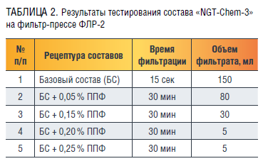 Определение показателя фильтрации проводили на фильтр-прессе низкого давления марки ФЛР-2. В ячейку фильтр-пресса ФЛР-2 загружали исследуемый состав после 48 часов созревания. Объем ячейки фильтр-пресса составляет 156 мл, тампонажный состав загружали в объеме 150 мл и подавали рабочее давление 0,7 МПа. В исследованиях использовался щелевой тип фильтра (параметры щели фильтра: ширина 300 мкм, длина 30 мм). Температура проведения тестов +20 °С. В ходе тестирования определяли объем фильтрата за 30 мин (таблица 2).
