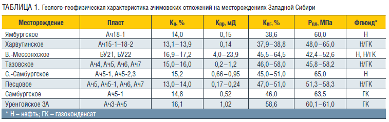 Геологическое строение ачимовки представляет собой неравномерное, часто линзовидное переслаивание алевролитов, плотных мелкозернистых песчаников и аргиллитоподобных глин и характеризуются сложным геологическим строением, существенной литологической и фильтрационной неоднородностью. В таблице 1 представлена геолого-геофизическая характеристика ачимовских отложений на некоторых месторождениях Западной Сибири, где подтверждается неоднородность отложений по простиранию – пористости, проницаемости и пластовым давлениям, а также виду пластового флюида (углеводорода) [1].