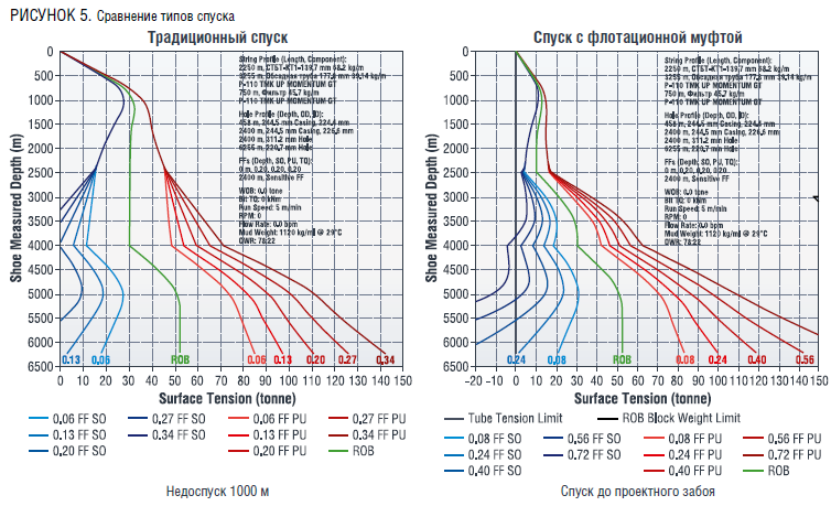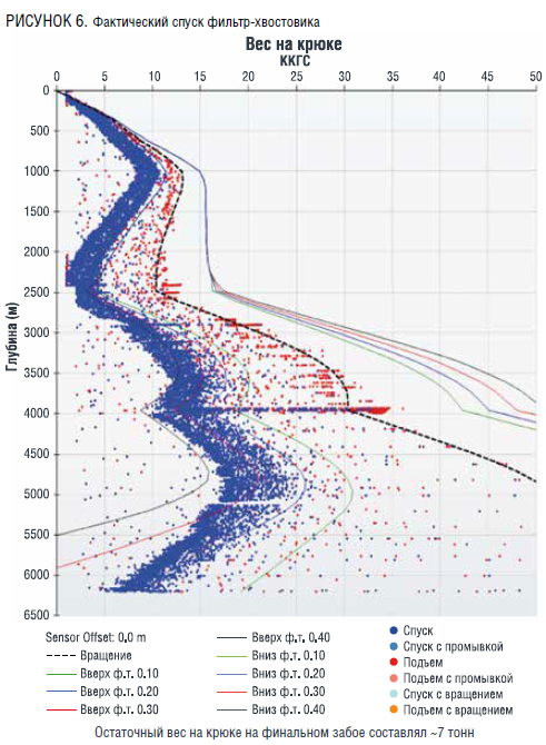 Как видно из предоставленных графиков, применение флотационной муфты позволяет спустить фильтр-хвостовик без вращения до проектного забоя, в то время как традиционный спуск значительно ограничен по глубине спуска – ~ 5500 м вместо целевых ~ 6200 м при коэффициентах трения ~ 0,2 и ~0,24 соответственно. Фактические результаты спуска (рисунок 6) подтверждают результаты расчетов и эффективность применения технологии.