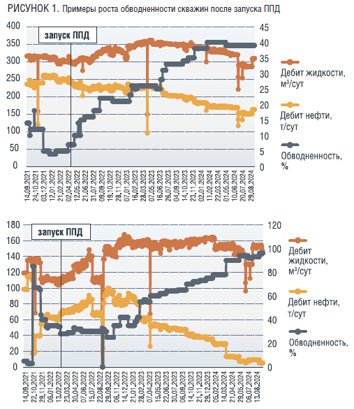 С 2022 по 2024 гг. на объекте наблюдается значительное повышение обводненности добываемой продукции (примеры работы скважин на рис. 1). При этом анализ характеристик вытеснения и оценки остаточных извлекаемых запасов указывает на явление преждевременного прорыва нагнетаемой воды. Значительное обводнение скважин происходит на второй год запуска нагнетательных скважин