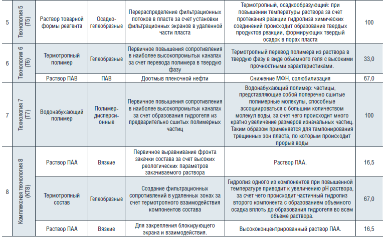 Важно отметить, что часть составов, в которых используется ПАА, во время данной работы была адаптирована под условия применения. Во время первичных тестов гелеобразующих составов на основе ПАА была выявлена несовместимость реагентов с закачиваемой водой, выраженная в отсутствие гелеобразования. Несмотря на среднюю жесткость (4 °Ж) и низкую минерализацию данной воды (10,8 г/дм3), формирование пространственной структуры гидрогеля не происходило даже после 48 ч выдержки.
