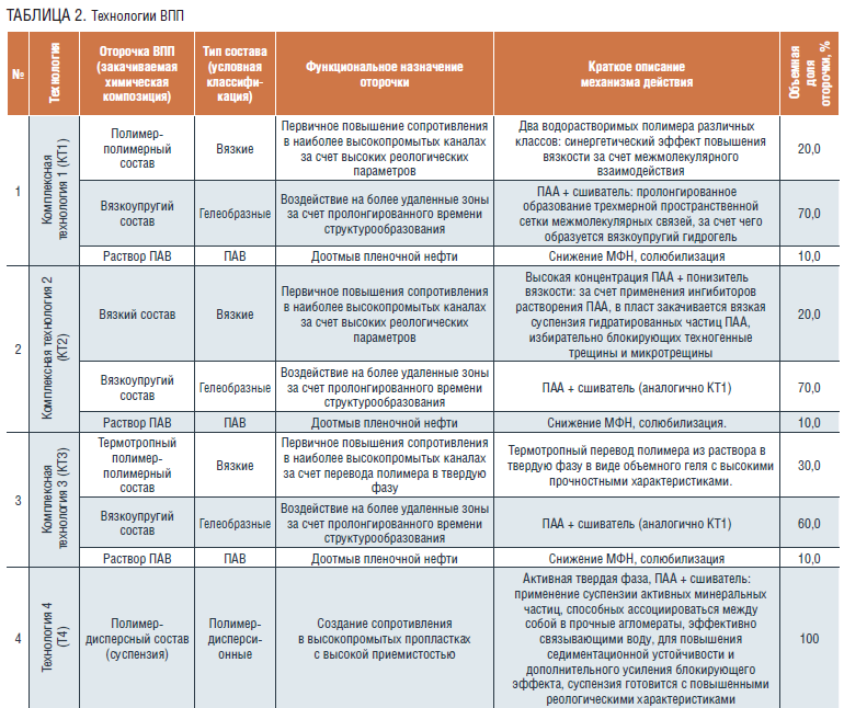 По способу реализации все технологии можно разделить на два блока. К первому относятся технологии, предполагающие закачку одной оторочки, представленной раствором или суспензией химических реагентов. Расширение критериев применимости достигается за счет варьирования концентраций реагентов и, соответственно, свойств получаемых композиций. Второй блок технологий ВПП – это комбинированные технологии, которые предполагают поочередную закачку композиций химических реагентов, различных по свойствам и функциональному назначению. Комбинирование оторочек химических реагентов позволяет повысить охват геолого-физических характеристик месторождений, за счет чего достигается высокая эффективность.