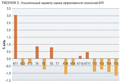 Предлагаемый критерий оценки составов отражает динамику изменения факторов сопротивления (рисунок 5). Положительное значение относительного критерия характеризует устойчивость или перераспределение состава в поровом пространстве, в то время как отрицательное указывает на вынос состава из модели или его разрушение. По данному критерию эффективными оказались технологии ВПП: КТ1, Т4, Т6, КТ10, КТ11. Для полученного результата отсутствует какая-либо корреляция с типом, производителем или комплексностью той или иной технологии. Можно предполагать различные причины данного результата, такие как качество реагентов, правильность подбора концентраций и соотношений в составах, что выходит за рамки данной работы. Основным выводом является необходимость испытания и оценки каждой планируемой к применению технологии ВПП.