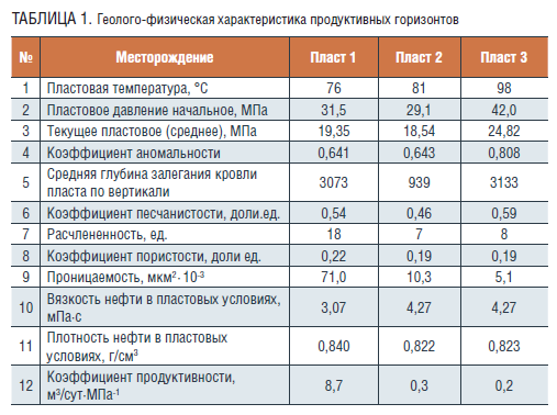 В качестве целевого объекта по подбору технологий ВПП рассматривается месторождение Западной Сибири, на котором с 2017 года ООО «Газпромнефть-Хантос» осуществляет операторскую деятельность по добыче жидких углеводородов. По количеству начальных извлекаемых запасов нефти месторождение относится к крупным, по геологическому строению – к сложным. Данное месторождение характеризуется сложным геологическим строением, промышленная нефтеносность установлена в нижнемеловых пластах Черкашинской свиты Неокомского нефтегазового комплекса. Выделено три нефтеносных пласта: пласт 1, пласт 2, пласт 3; количество нефтяных залежей – три. Наибольшее количество геологических запасов нефти по месторождению сосредоточено в пласте 1. Все пласты представлены в большей степени песчаником кварцевым плотным мелкозернистым, а также алевролитами, аргиллитами и переслаиванием указанных пород. Геолого-физическая характеристика по пластам представлена в таблице 1.