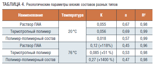Реологические свойства «вязких» составов оценивали путем регистрации кривых течения жидкостей и определения параметров реологической степенной модели (закон Оствальда-де Ваале). Интерес представляют полученные различия в реовязкостном поведении вязких растворов различных полимеров (таблица 4). Можно отметить, что все исследуемые вязкие системы при растворении реагентов в воде образуют псевдопластичные жидкости n < 1. Закономерно с ростом температуры у исследуемых составов уменьшается показатель нелинейности n и возрастает коэффициент консистентности К. Наиболее значительные изменения консистентности с увеличением температуры отмечены для полимер-полимерного состава.