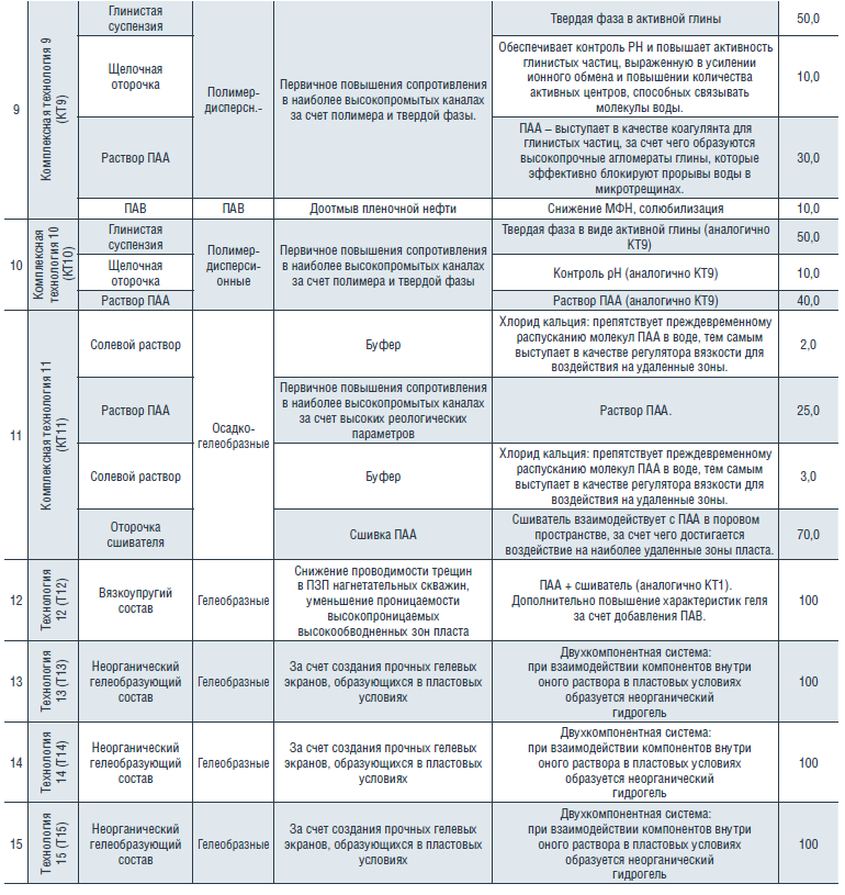 На текущий момент существует широкий спектр химико-технологических решений по данному направлению. Отечественный рынок предлагает более 50 технологий ВПП, включающих использование различных осадко-, гелеобразующих, полимерных и других составов, в значительной степени отличающихся по своим физико-химическим, реологическим и структурно-прочностным свойствам, а также способам закачки.