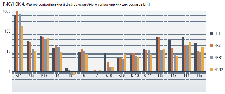 Коллектив авторов предлагает применять четырехфакторную оценку результатов фильтрационных экспериментов на линейных моделях, т.е. дополнительно определять фактор сопротивления (FR2) при прорыве состава ВПП водой, фактор остаточного сопротивления (FRR2) при установлении перепада давления после форсированных режимов фильтрации. Оцениваемые параметры рассчитывались по формулам: