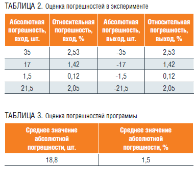 Измеряется количество частиц на входе и выходе эксперимента для оценки погрешности программы и рассчитывается абсолютная (2) и относительная (3) погрешность. Для оценки математического ожидания определяется среднее значение погрешностей для всех экспериментов (таблица 3):