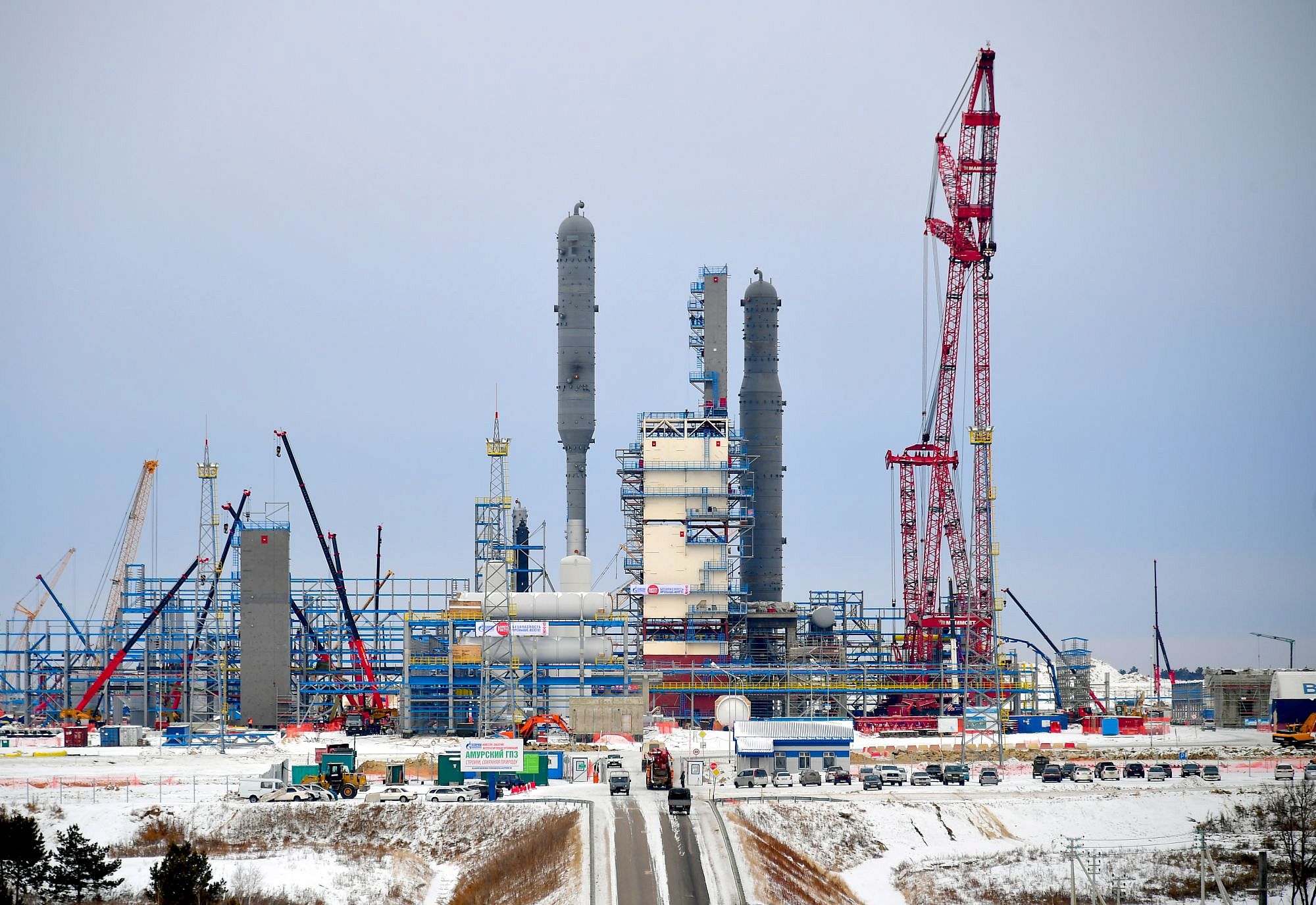 Почти стометровые колонны газоразделения установлены на трех из запланированных шести технологических линий нового газоперерабатывающего завода в Приа